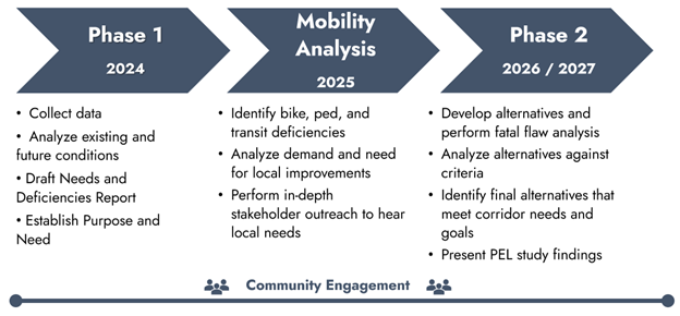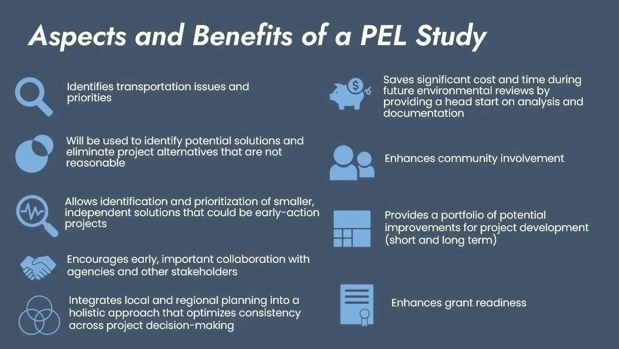 What does this mean? The PEL process is a planning effort that brings together members of the public that use or have an interest in the study area to consider the benefits and impacts of proposed transportation solutions.