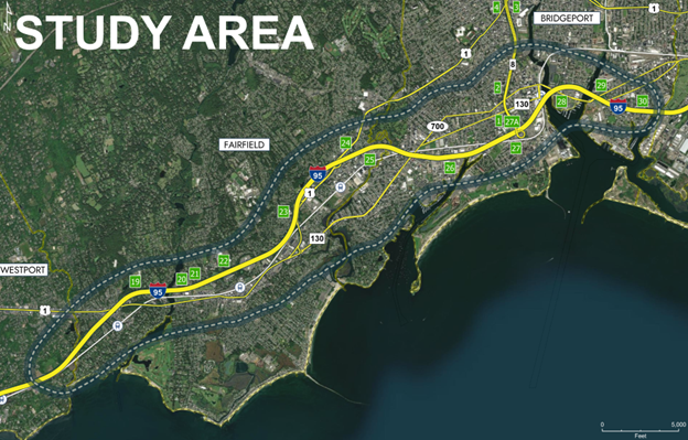 The Connecticut Department of Transportation (CTDOT) is performing a Planning and Environment Linkages (PEL) Study to explore ways to improve mobility and travel conditions along the I-95 corridor in Fairfield and Bridgeport. I-95 in Fairfield and Bridgeport is one of the most heavily traveled roadways in the state and carries approximately 120,000-130,000 vehicles per day. Post Road and Kings Highway (US Route 1) in Fairfield and State Street (Route 130) and Fairfield Avenue (State Road 700) in Bridgeport add to the daily traffic within the corridor. In addition to car and truck traffic, rail (Metro North Railroad and Amtrak), buses, bicyclists, and pedestrians travel within the corridor every day.